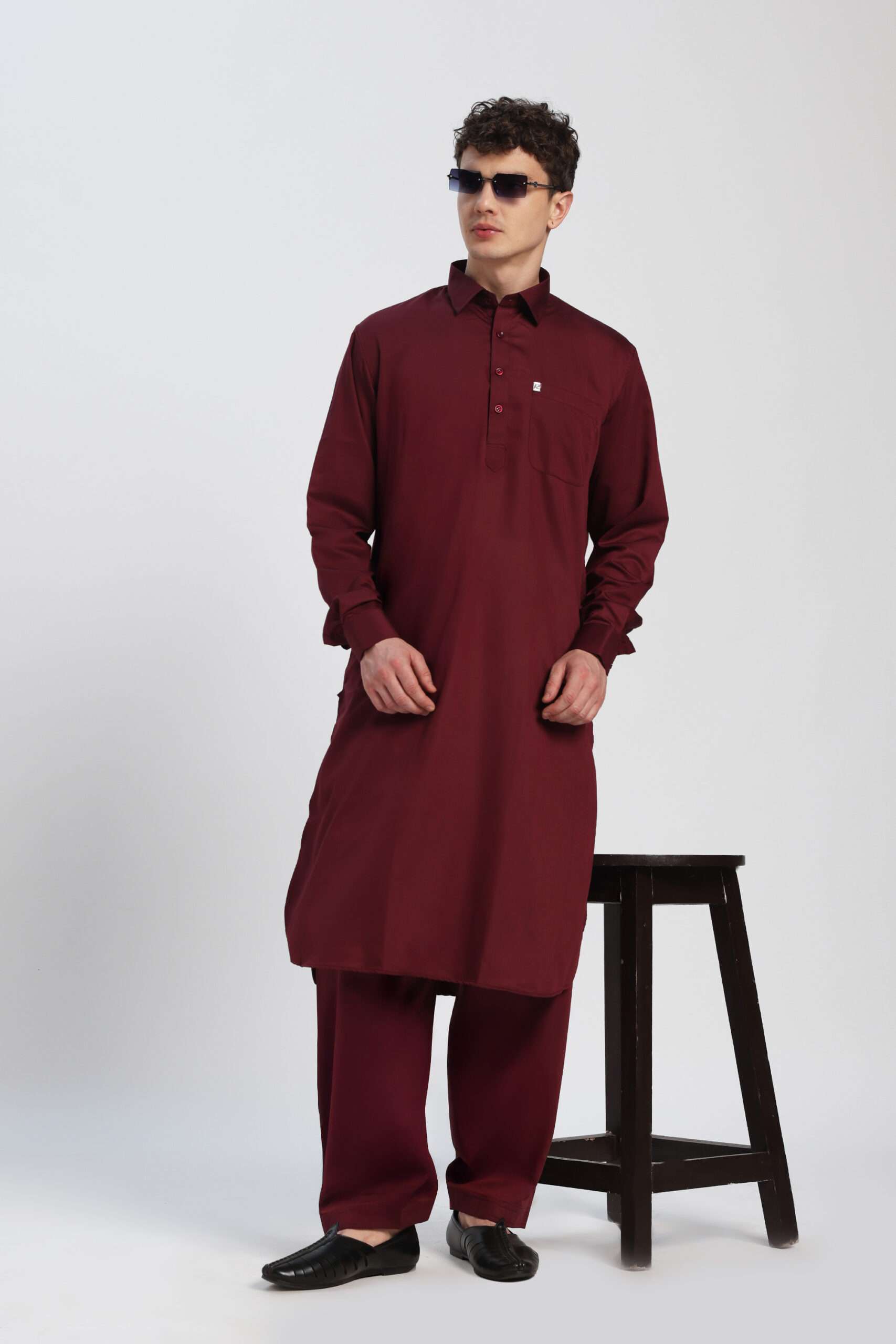 Command attention in the Rehan Kurta Maroon Pathani Suit, a regal addition to our signature collection. Crafted from a high-performance Cotton Blend, this suit is engineered for a crisp, wrinkle-resistant finish that maintains its sharp silhouette from day to night. Featuring a traditional curved-hem kameez, a structured shirt collar, and a matching volume-cut salwar, it offers the perfect fusion of heritage style and modern durability for weddings and festive celebrations.