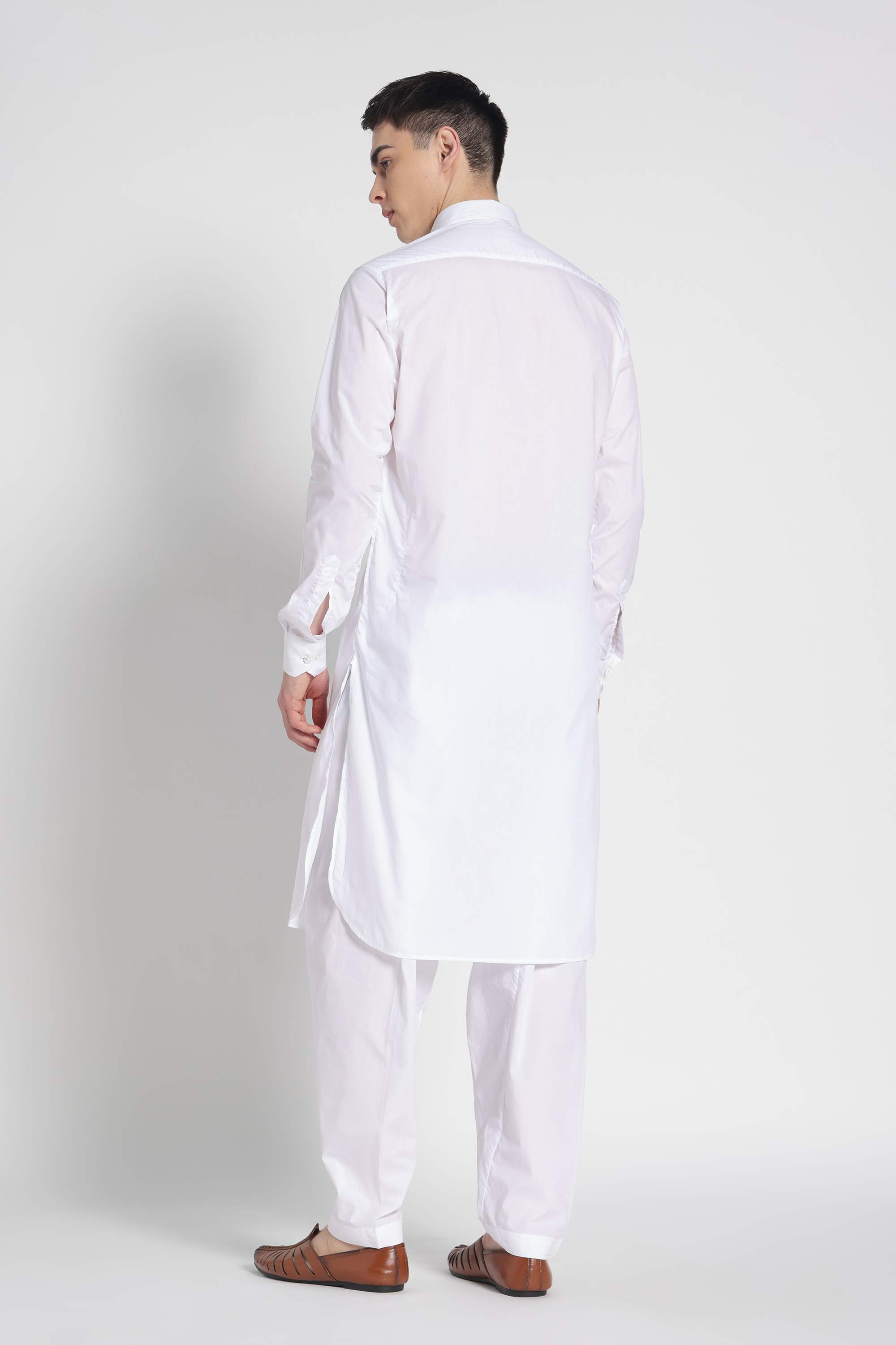 A powerful and iconic 100% Cotton Pathani Suit in a crisp, brilliant white. This two-piece set features the signature rounded hem (kabli cut) and wide-leg salwar, combining traditional frontier style with modern comfort.
